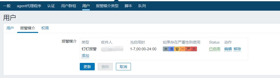 10.配置告警用户,点击管理->用户->Admin->报警媒介,修改以下内容.