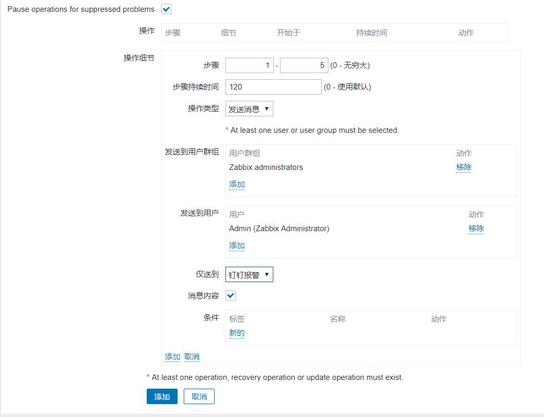下图表示触发5次动作,每隔120秒触发一次,告警发给 admin 用户,用钉钉媒介发送.