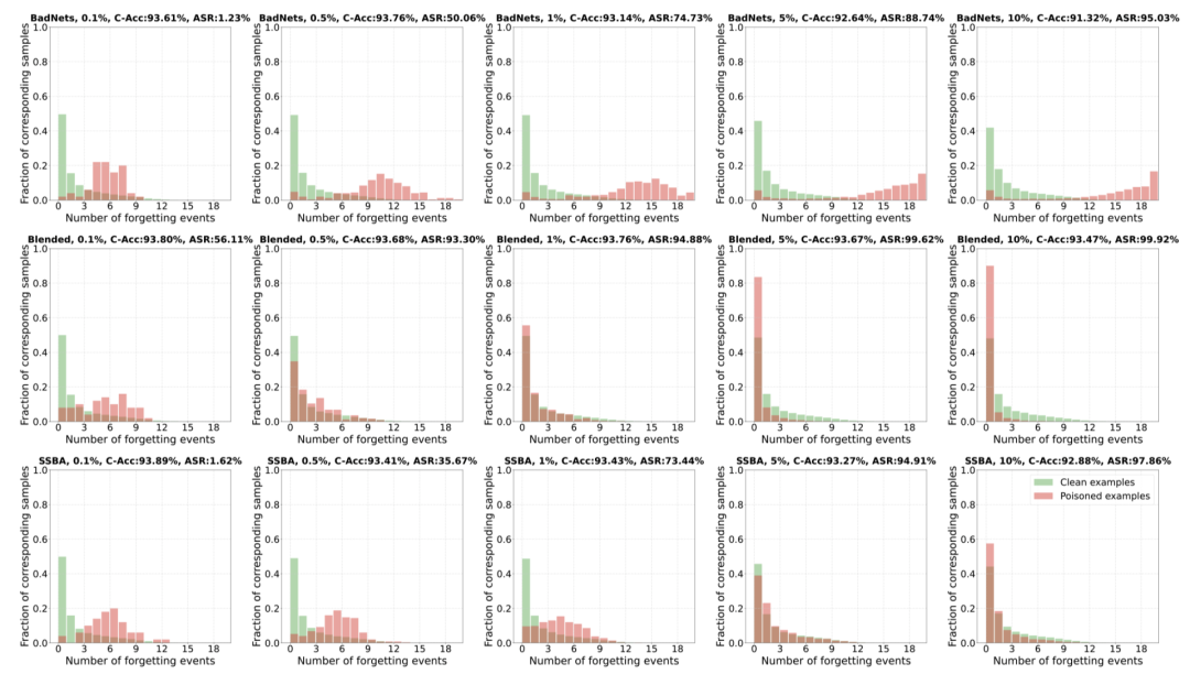 我们采用论文《An empirical study of example forgetting during deep neural network learning》中提出的研究方法,使用遗忘事件的数量来衡量后门的遗忘性,我们的结果如下图所示: