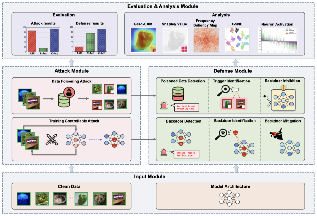 3、防御模块:接收攻击模块的输出,为投毒数据集提供了投毒样本检测、后门定位和后门抑制等防御方法;为后门模型提供了后门检测、后门神经元定位、后门消除等防御方法。