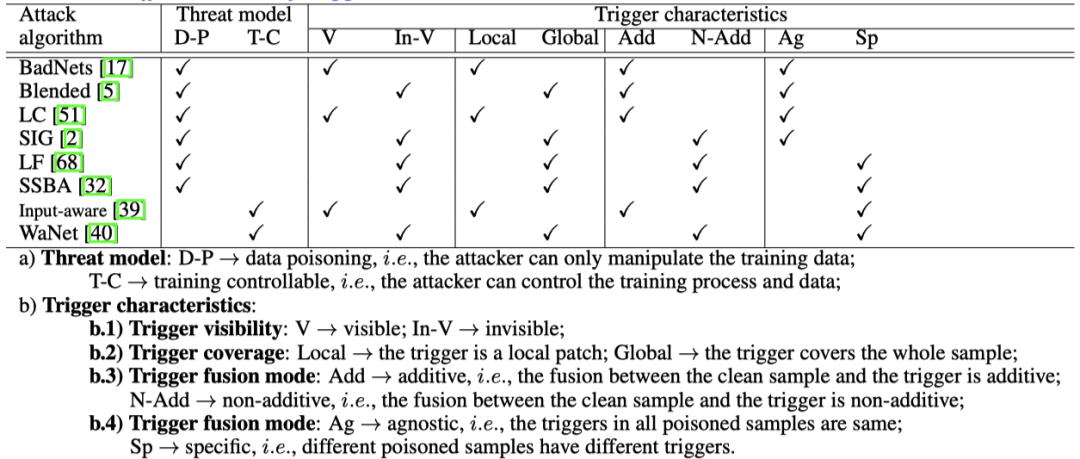 BackdoorBench目前已经集成了主流的9种攻击和12种防御算法,目前已经进行完整测试的攻击和防御方法如下图所示: