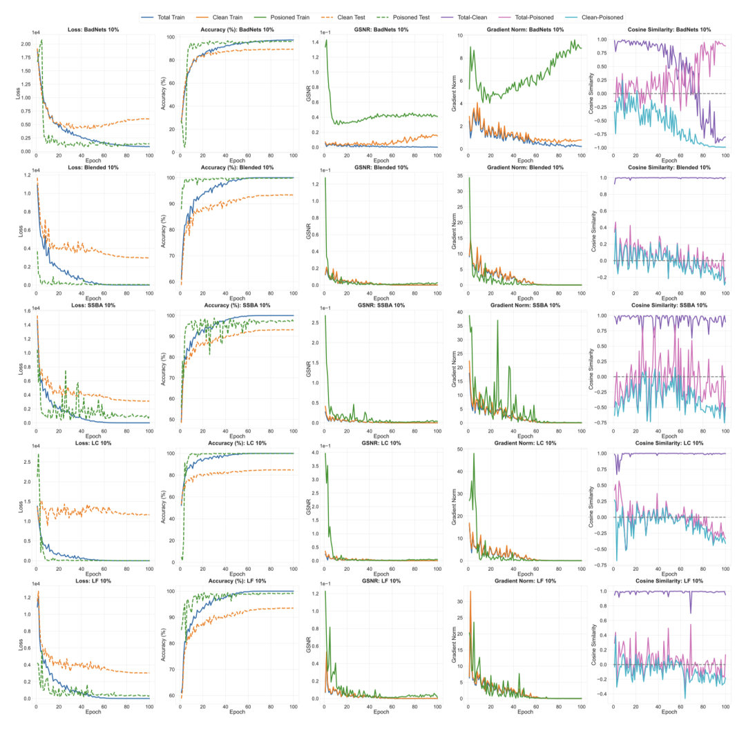 为了解释这样的现象,我们首先观察到在训练的早期阶段,中毒样本的梯度信噪比明显大于干净样本的梯度信噪比 (如第三列所示)。中毒样本的高梯度信噪比表明,后门具有更好的泛化性能,这与中毒测试样本上更高的准确性(ASR)和更低的损失函数是一致的。