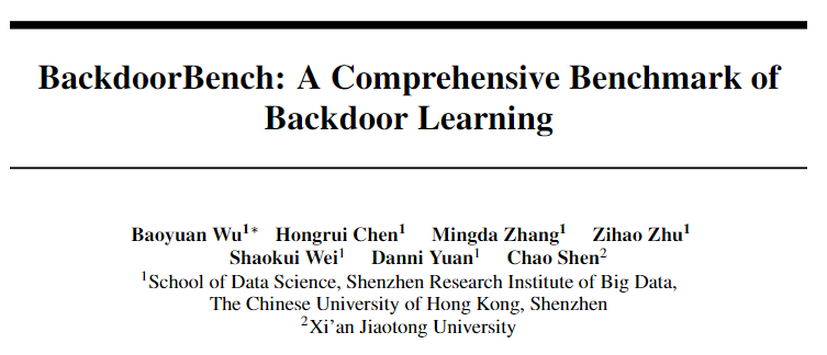 最近香港中文大学(深圳)吴保元教授课题组与西安交通大学沈超教授课题组联合发布了一个后门攻击与防御基准BackdoorBench。