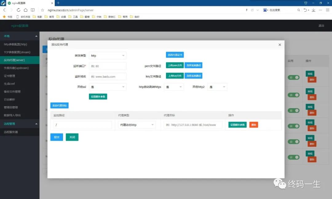 在反向代理中可配置nginx的反向代理即server项功能,可开启ssl功能,可以直接从网页上上传pem文件和key文件,或者使用系统内申请的证书,可以直接开启http转跳https功能,也可开启http2协议。