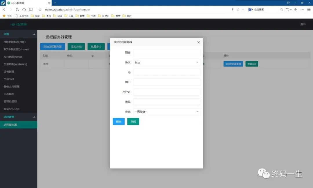 远程服务器管理,如果有多台nginx服务器,可以都部署上nginxWebUI,然后登录其中一台,在远程管理中添加其他服务器的ip和用户名密码,就可以在一台机器上管理所有的nginx服务器了。