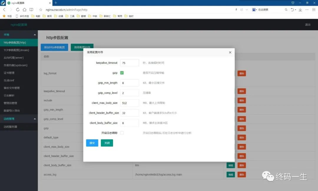 在http参数配置中可以配置nginx的http项目,进行http转发,默认会给出几个常用配置,其他需要的配置可自由增删改查。可以勾选开启日志跟踪,生成日志文件。