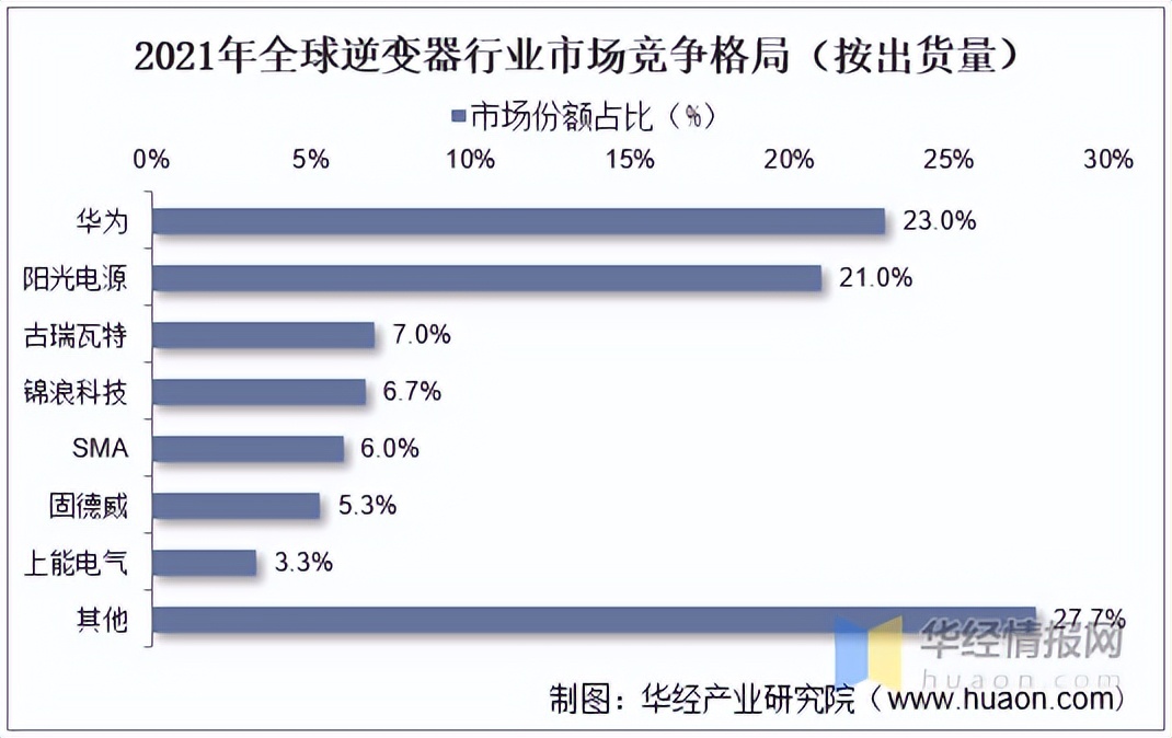 在国内主要玩家中,根据华经产业研究院统计,华为、阳光电源当之无愧第一梯队,2021年两家合计分掉全球44%的市场份额。