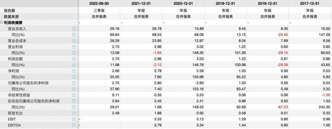 再到2022年前三季度,公司实现营收29.16亿元,同比增长69.64%,但归母净利润只有2.75亿元,同比仅增长27.9%。