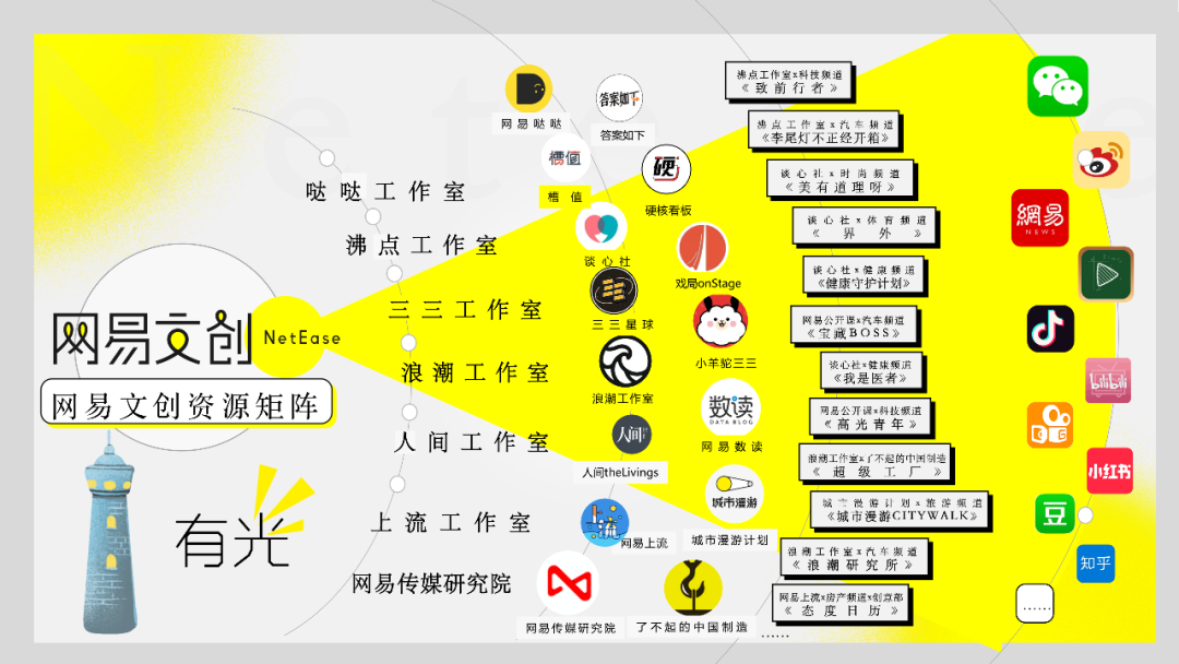 目前网易文创旗下已经有网易哒哒、浪潮工作室、谈心社、小羊驼三三、槽值、人间、硬核看板、网易数读等20多个头部内容IP,内容触角延伸到青年社交互动、情感洞察、青年文化、新商业新消费、影视版权、知识科普、城市文化等与生活息息相关的领域,在全网拥有3.5亿粉丝,覆盖了网易新闻、网易云音乐、微信、微博、B站、抖音、快手、知乎、YouTube等主流平台。