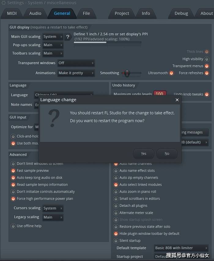 (3)随后FL Studio编曲软件会弹出一个提示,大致意思是FL Studio需要重启以启动刚才的修改,这里我们直接点击“Yes”即可。