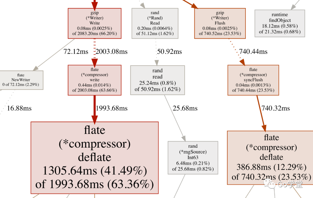 pprof为了图形化的整体大小,会自动删减一些节点,所以,图形界面中显示的并不是所有的节点。这里通过边线是实线还是虚线来体现。虚线代表两个节点之间有其他的节点调用,但未显示。实线则代表两个节点之间是直接调用的。