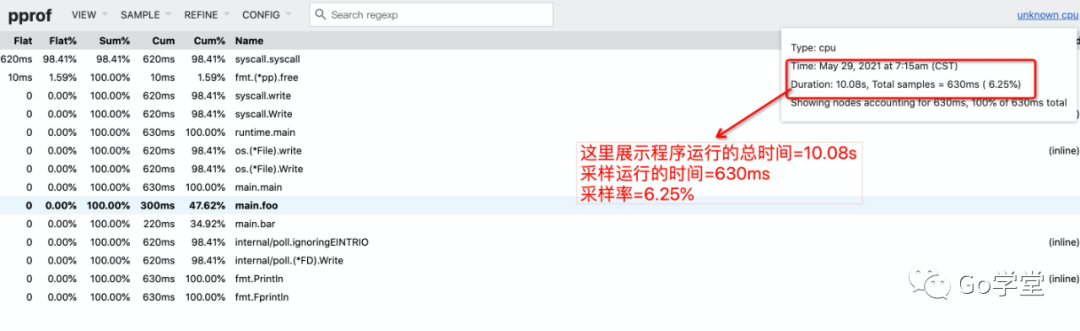 举例说明:函数`demo`由三部分组成:调用函数`foo`、自己直接处理一些事情、调用函数`bar`,其中调用函数`foo`耗时1秒,自己直接处理事情耗时3秒,调用函数`bar`耗时2秒,那么函数`demo`的`flat`耗时就是3秒,`cum`耗时就是6秒。