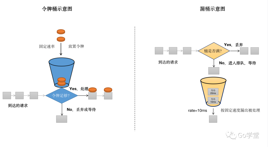 令牌桶与漏桶的区别在于漏桶控制的是请求被处理的速率。即当有请求的时候,先进入桶中进行排队,按固定的速率流出被处理;而令牌桶控制的是令牌产生的速率。即当有请求的时候,先从令牌桶中获取令牌,只要能获取到令牌就能立即通过被处理,不限制请求被处理的速度,所以也就可以应对一定程度的突发流量。如图所示二者的区别: