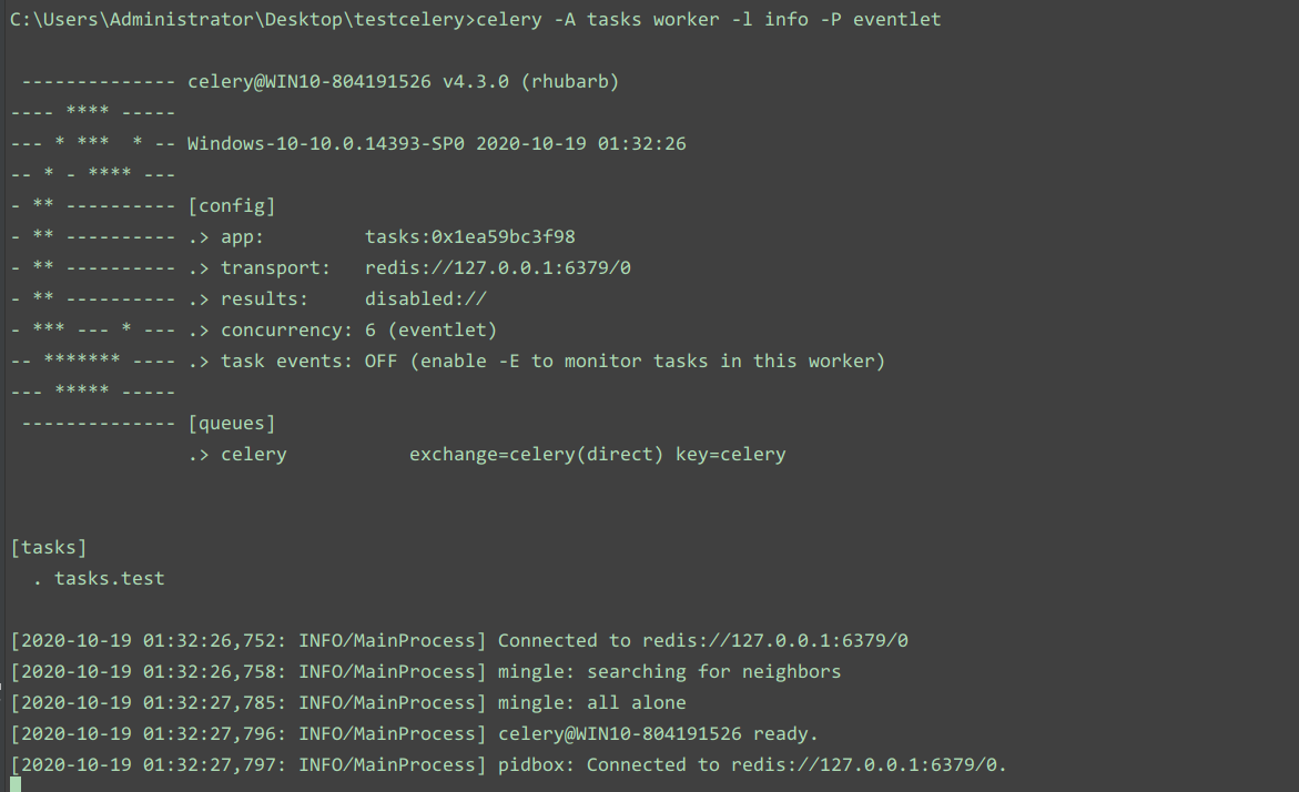 celery -A tasks worker --loglevel=info如果是win10,并且使用我上面的环境,还需要安装一个