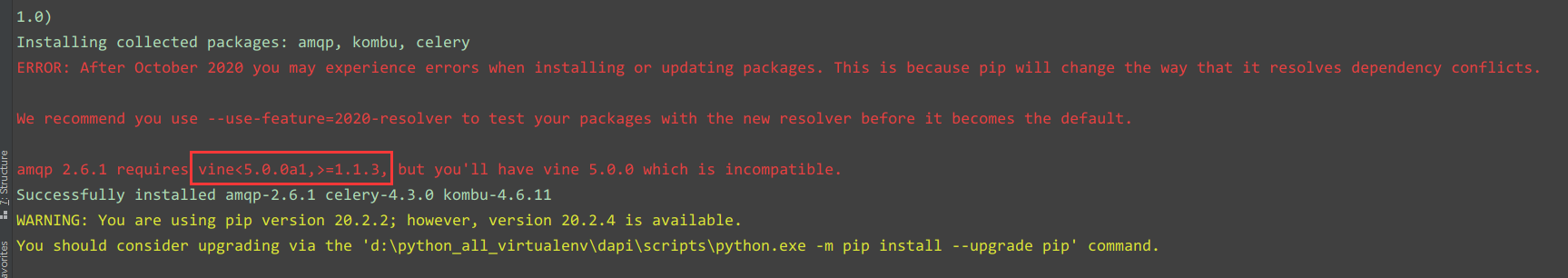 celery安装的时候,会把amqp、vine和kombu一起安装完成,所以一定要注意celery版本要和amqp、vine和kombu匹配,不然你将很麻烦。