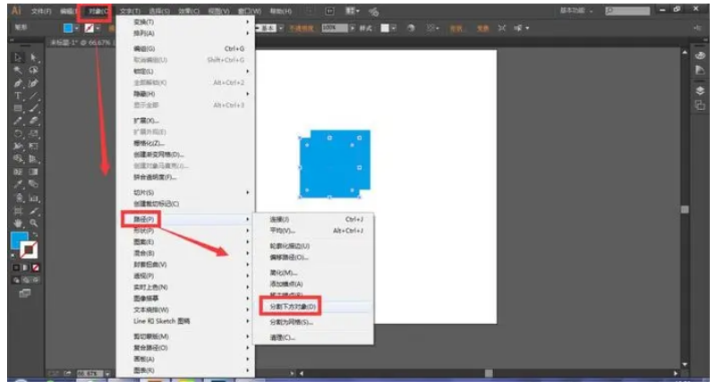 3、然后选择菜单栏中的对象菜单, 选择路径-分割下方对象
