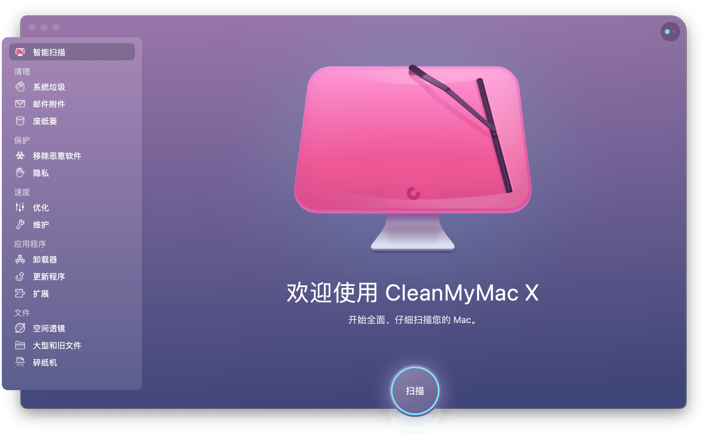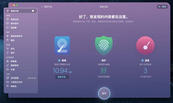 如同软件的命名CleanMyMac一样,这款应用的核心在于“Clean”,也就是清理日常使用Mac过程中产生的缓存文件。而CleanMyMac X也将“智能扫描”放在和最优先的位置上。它的智能扫描功能将清理、保护以及速度三大功能整合到一起,只需一键即可扫描到Mac内的垃圾文件,并且帮助我们找到Mac内的潜在威胁和提升运行速度的方式。