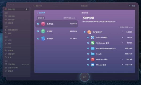 如果你的存储空间有限,便可在运行“智能扫描”后清除系统内存在的应用缓存或临时文件,但需要特别注意的是,我们一定要点击摘要查看缓存文件是否为必需文件。CleanMyMac X会扫描所有应用产生的缓存文件,包括微信钉钉等工具的缓存数据以及优酷爱奇艺等视频应用的缓存视频,在清理之前,请务必确认自己是否需要清理这些缓存数据。