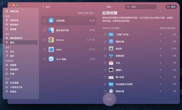 macOS的一些操作逻辑与iOS类似,在首次开启应用时,系统会提示我们“应用需要获取XX权限”,而CleanMyMac X能够将所有的应用权限进行整合,帮助我们了解到哪些应用被赋予了权限。如果我们不希望某款App被赋予权限,也可以直接通过CleanMyMac X实现关闭。例如我不希望Chrome浏览器使用我的麦克风,便可在CleanMyMac X中关闭权限。