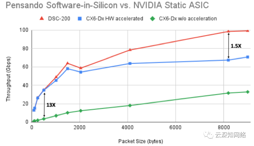 我们发现,对于较小的数据包,CX-6 Dx架构对硬件卸载的流量加速表现良好。 然而,当数据包增大到256字节以上时,就与DSC-200就拉开了差距,DSC-200性能比NVIDIA ASIC高出1.5倍。