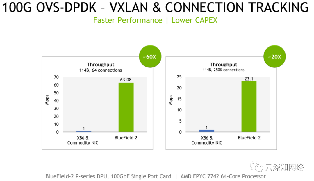 在这一点上,如你看到的,这是另一个苹果和橘子的案例,但请忍耐一下。ConnectX-6 Dx ASIC与BlueField-2中使用的ASIC完全相同。此外,我们利用主机中的内核来取代BlueField-2中的内核,而且内核数是BlueField-2中的四倍,这也对NVIDIA是更有利的条件。在我们进一步讨论之前:如果有人能提供BlueField-2 100G,我们可以做一个精确的苹果对苹果的比较。
