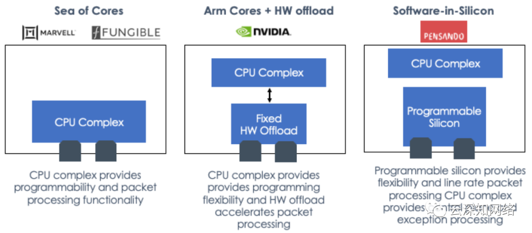这就是架构之间的关键区别。CX-6 Dx(以及延伸的BlueField 2)架构依赖于硬件卸载,它建立在静态的ASIC、API、兼容的驱动程序,以及将流量卸载至ASIC的软件上。这种方法是一种折中的方式,最明显的就是: