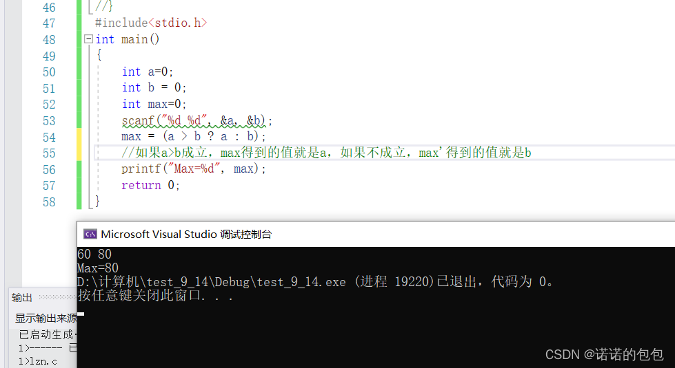 exp1?exp2:exp3 如果表达式1为真,那么表达式2为真,表达式2的结果为整个表达式的结果,表达式3不算。 如果表达式1为假,那么表达式2不算,表达式3算,他的结果为整个表达式的结果‘ 举个例子: 像这种用来比较大小的,就可以用三目操作符运算