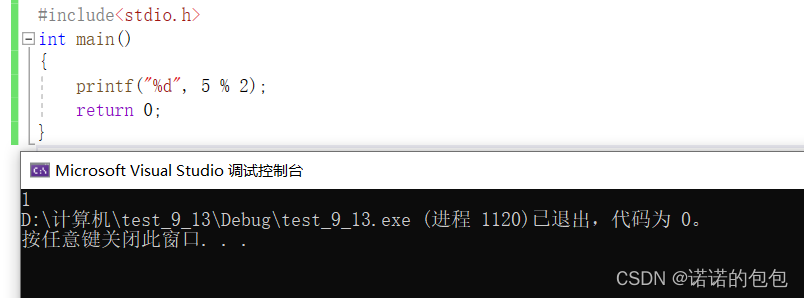 + - * / %加减乘除就不用多说了,下面讲一下%的用法,%就是用来取余用的,就比如说:5/2,在数学里我们通常把得到的结果写成2.5,但是在C语言中,得到的结果应该是:得2余1,%就是用来取余所用。话不多说,上代码实例:
