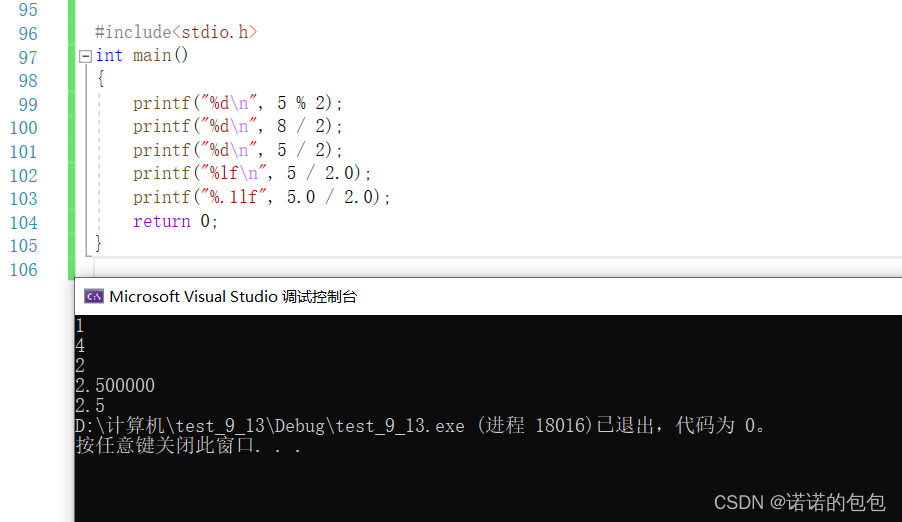 得到的结果怎么是2呢?那是因为%d是打印整形,只是打印出了5/2得到的整数部分,也就是2. 那该如何打印出完整答案2.5,而不仅仅只是一个整数或者余数呢?,很简单,用%lf即可,如果答案保存一位小数,就用%.1lf;同理,打印两位小数,就用%.2lf;以此类推…,但是要注意一点!!! 就是printf打印时用%lf打印出来的是浮点型参数,所以5/2要写成5/2.0的格式,或者5.0/2或者5.0/2.0的·格式, 各种案例+运行结果如下:
