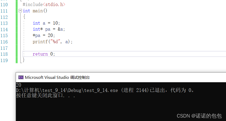 这里的*pa=20;就是解引用操作。 指针变量的大小 指针变量的大小取决于地址的大小,也就是说,地址存储多大空间,指针变量就多大。 在32位机器中,1个地址是32的二进制位,存储需要32个比特位空间,也就是4个字节, 同样,在64为机器中,存储需要8个字节。