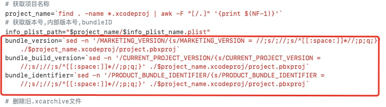 bundle_version=`sed -n '/MARKETING_VERSION/{s/MARKETING_VERSION = //;s/;//;s/^[[:space:]]*//;p;q;}' ./$project_name.xcodeproj/project.pbxproj`