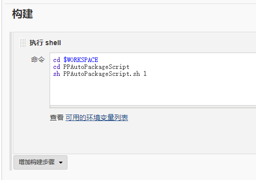 cd $WORKSPACE cd PPAutoPackageScript sh PPAutoPackageScript.sh 1