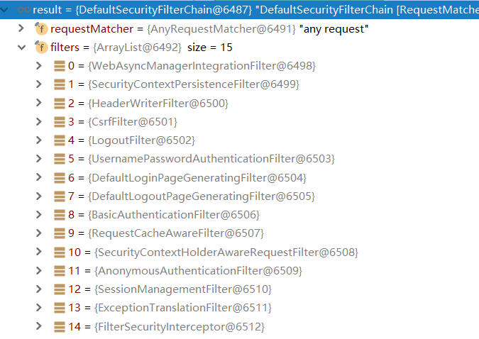 我们可以通过Debug查看当前系统中SpringSecurity过滤器链中有哪些过滤器及它们的顺序。