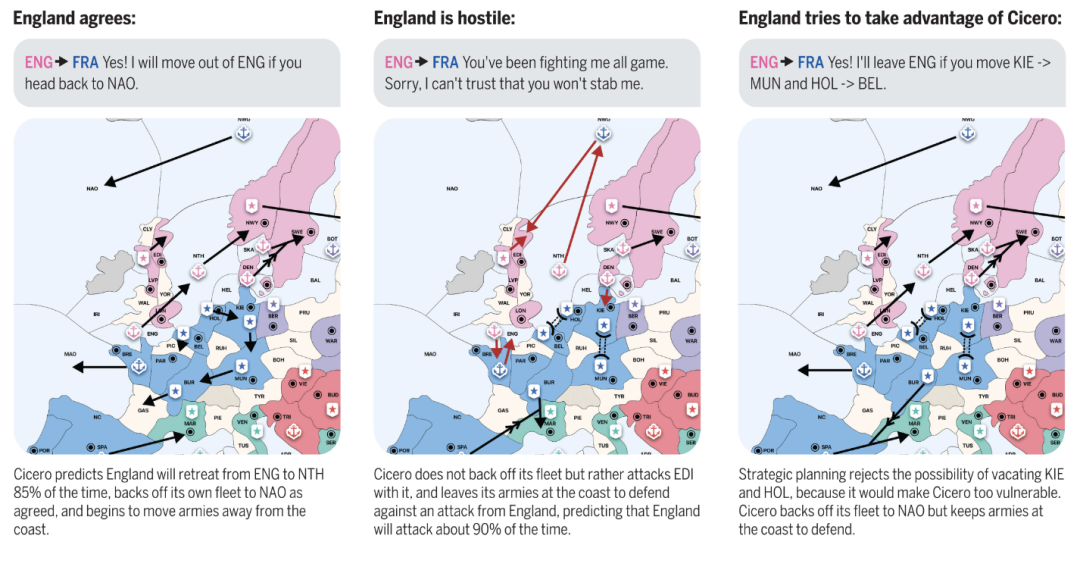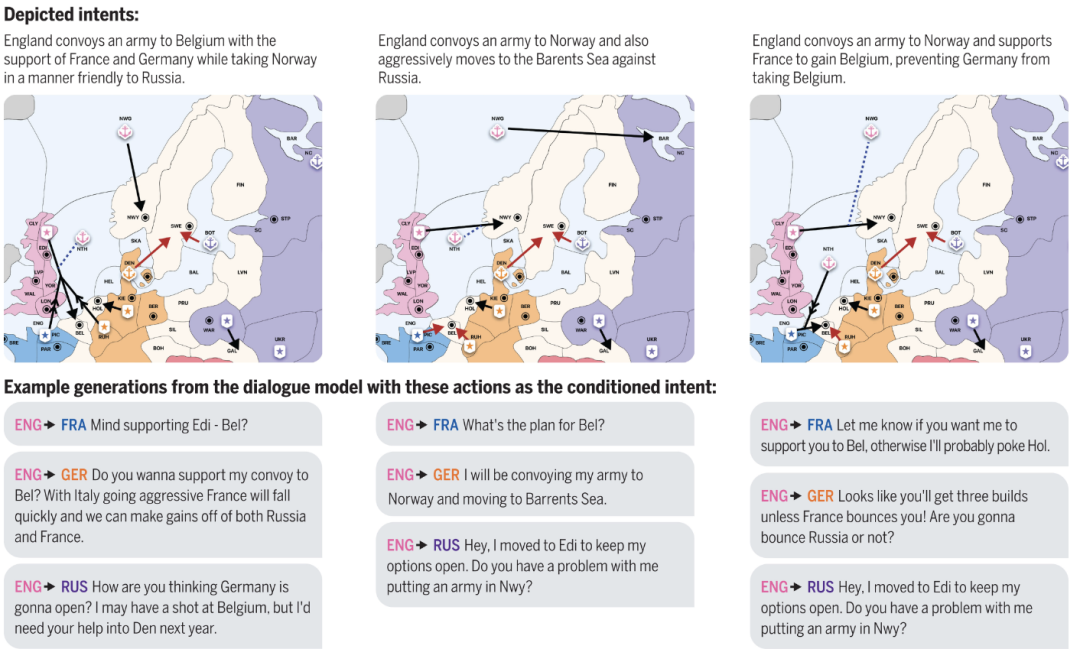 如图6所示,Cicero代表的是英国,在不同的意图下,它向法国、德国、俄罗斯生成的对话完全不同,但都是符合意图的。