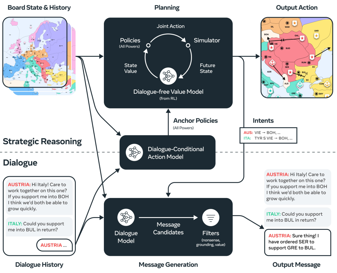它们分别是:1. 『战略推理』,2. 『自然语言处理』。 在这两个模块的帮助下,Cicero可以推断,到了游戏后期,它会需要哪位玩家的支持,然后制定策略以赢得该玩家的青睐,甚至认识到该玩家从其特定角度看到的风险和机会。