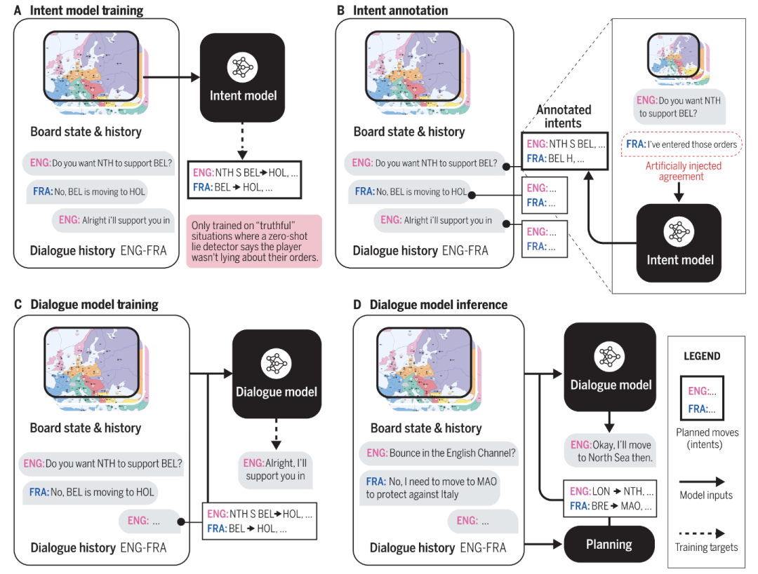 如图7所示,action被表示为命令串的形式,如" NTH S BEL -> HOL" 标识北海将支持比利时到荷兰。意图模型根据往家的对话的state和历史来预测玩家行为(图7 A)。然后,通过意图模型,对训练数据集的每条消息进行注释(图7 B)。经过训练的对话模型可以在给定目标消息的意图注释的情况下进行预测(图7 C)。