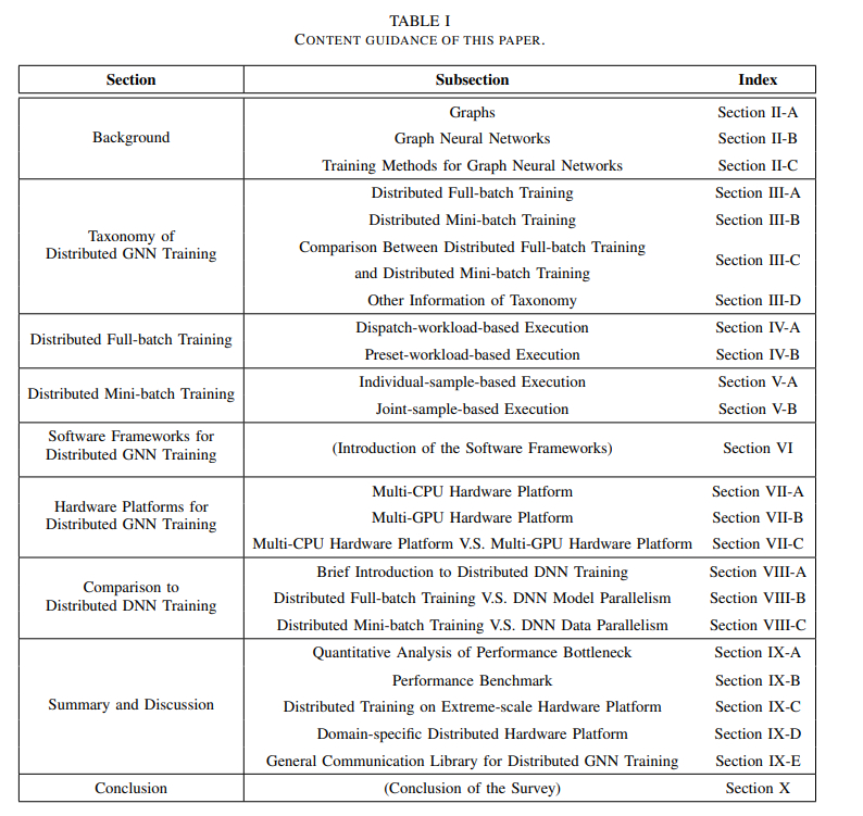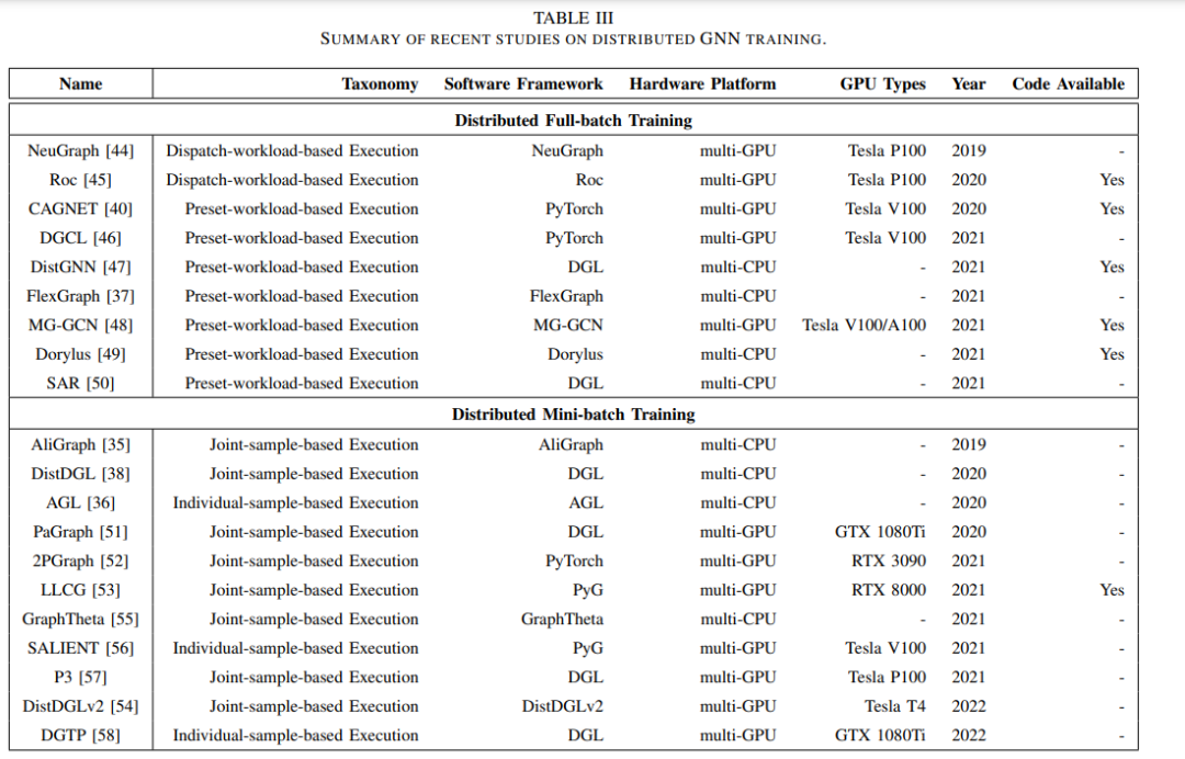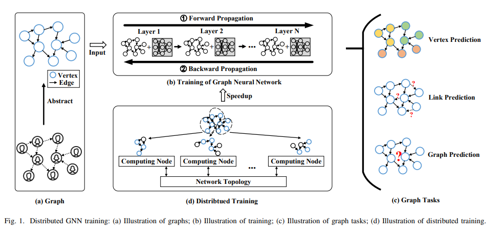 分布式训练是加速GNN训练[35]-[38],[40],[44]-[58]的流行解决方案。它试图通过向计算系统添加更多的计算资源或“节点”,并采用并行执行策略来加速整个计算过程,如图1 (d)所示。2019年提出的NeuGraph[44]是分布式GNN训练的第一篇发表作品。从那以后,近年来,人们不断尝试提高分布式GNN训练的效率,使用了各种各样的优化技术,包括工作负载分区[44]-[47],传输规划[37],[44]-[46],缓存策略[35],[51],[52]等。尽管做出了上述努力,但仍然缺乏对分布式GNN训练的综述。多个计算节点之间的管理和合作需要导致不同的工作流程,导致复杂的计算和通信模式,并使优化分布式GNN训练成为一个挑战。然而,尽管在这方面已经或正在做出大量的努力,但几乎没有任何关于这些挑战和解决方案的调研。目前的研究主要集中在GNN模型和硬件加速器[9]-[11],[59]-[62],但并不打算对GNN的分布式训练进行仔细的分类和总体概述,特别是从工作流、计算模式、通信模式和优化技术的角度。