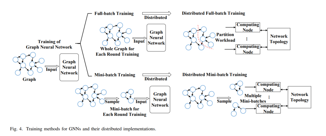 在本小节中,我们介绍了GNN的训练方法,包括全批训练[69],[70]和小批训练[13],[71]-[74]两种方法。神经网络(GNN)的典型训练过程包括前向传播和后向传播。在正向传播中,输入数据通过神经网络层传递到输出。神经网络通过将前向传播的输出与预先定义的标签进行比较,产生输出的差异。然后在反向传播中,将这些差异沿相反方向在神经网络层中传播,生成梯度来更新模型参数。如图4所示,根据每轮是否涉及整个图,GNN的训练方法可分为全批训练[69]、[70]和小批训练[13]、[71]-[74]。这里,我们定义了一轮全批训练,包括模型计算阶段(包括前向和后向传播)和参数更新阶段。另一方面,小批处理训练中的一轮额外包含一个采样阶段,该阶段对后续模型计算所需的小型工作负载进行采样,因此定位在其他两个阶段之前。因此,一个epoch被定义为数据的整个传递过程,相当于一轮全批训练,而小批训练通常包含几轮。下面将详细介绍这两种方法。