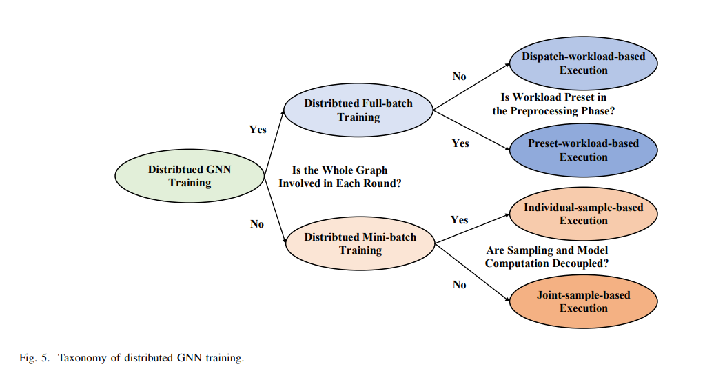 本节介绍分布式GNN训练的分类。如图5所示,我们首先根据第II-C节介绍的训练方法,即每轮是否涉及整个图,将其分为分布式全批训练和分布式小批训练,并显示两种类型的关键区别。通过分析这两种类型的工作流程,将它们分别划分为两个详细的类型。本节介绍了第一级类别,即分布式全批训练和分布式小批训练,并对它们进行了比较。这两种类型的第二级类别稍后将分别在第四节和第五节介绍。