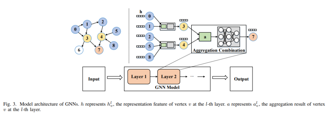 GNN是一种很有前途的从图数据中学习知识的算法模型[63]-[68]。它将图数据作为输入,并学习图中每个顶点的表示向量。学习到的表示可以用于下游任务,如顶点预测[15],链接预测[16]和图预测[17]。如图3所示,GNN模型由一个或多个层组成,包括邻居聚合和神经网络操作,分别称为aggregation步骤和Combination步骤。在Aggregation步骤中,使用Aggregate函数Aggregate()为每个目标顶点聚合来自上一GNN层的传入相邻顶点的特征向量。例如,在图3中,顶点4将使用Aggregate函数收集自身及其传入邻近顶点(即顶点2,5,8)的特征向量。在Combine步骤中,Combine函数Combine()使用神经网络操作转换每个顶点的聚合特征向量。