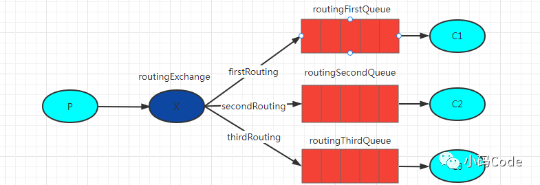 routingExchange,根据不同的routingKey绑定不同的队列:firstRouting路由键绑定routingFirstQueue队列。secondRouting路由键绑定routingSecondQueue队列。thirdRouting路由键绑定routingThirdQueue队列。
