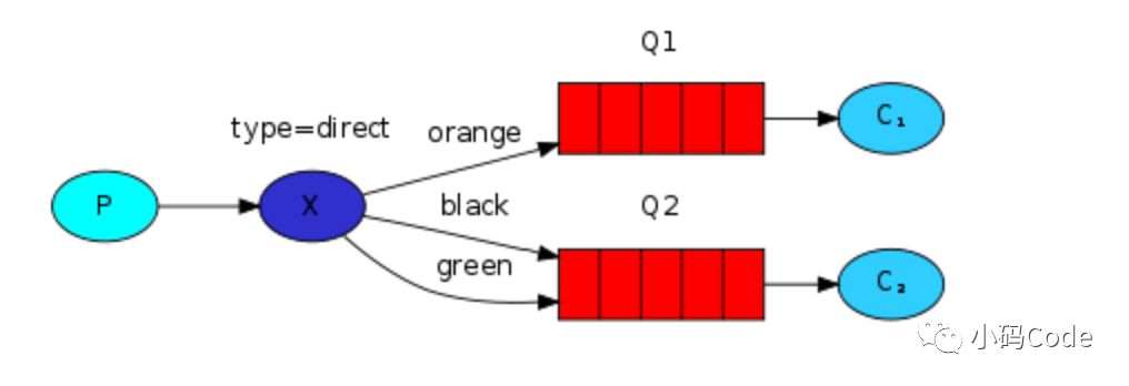 路由模式使用直连交换机,该模式下根据routingKey绑定特定的队列。