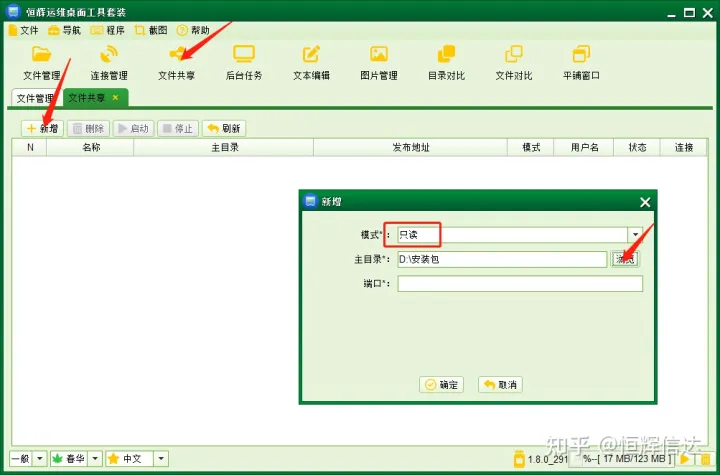 在HHDESK首页点击文件共享——新增;随后在弹出框中根据需求选择只读/读写;然后点击浏览,选择需要共享的文件夹,并输入端口。