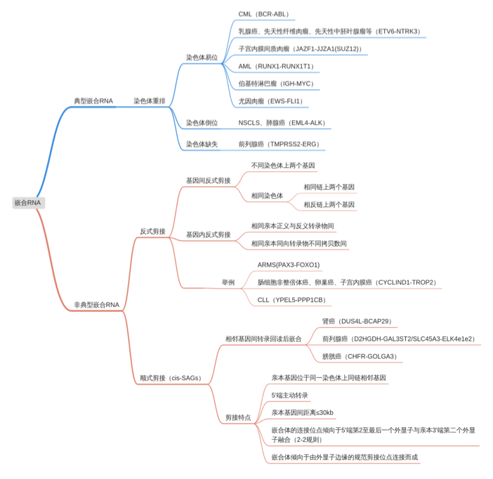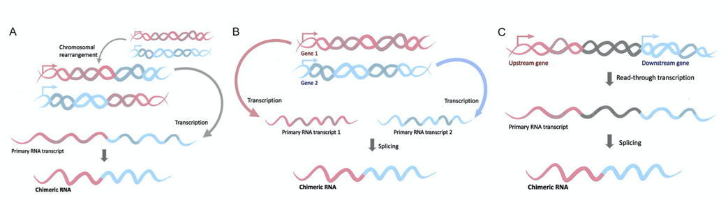 嵌合RNA的定义是来自两个最初分离的基因的RNA序列杂交后的转录产物。因此嵌合RNA可以通过不同的机制产生,如融合基因转录或基因间剪接。在这一章节中,我们将从嵌合RNA的生物发生途径上分类描述它们。