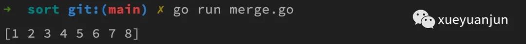 通过上面的分析,我们知道归并=递归+合并,对应的 Go 实现代码如下: