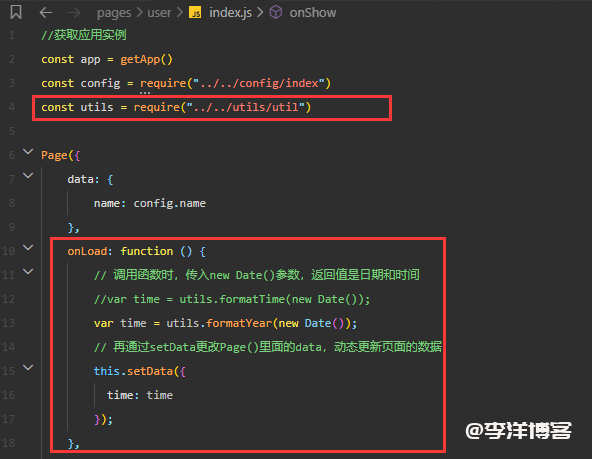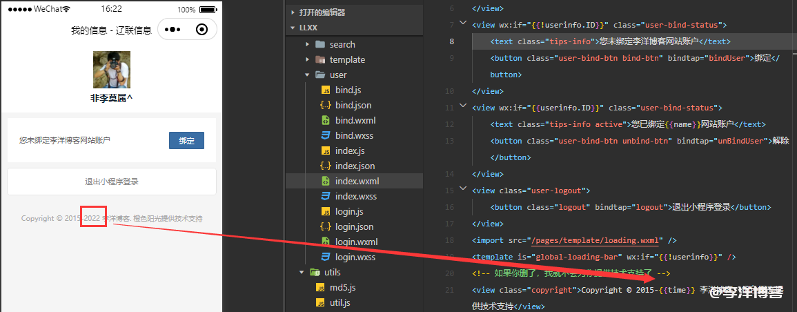代码要放在Page之内,还是那句话,修改前记得备份,修改完成后保存,然后在3.4行的位置引入util.js文件,然后找到“/pages/user/index.wxml”文件,在最后一行找到版权代码,如图: