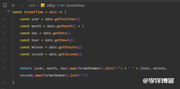 首先要知道微信小程序已经集成了时间代码,打开项目里面默认生成的 utils/util.js 文件,这里可以看到,代码已经写好了,我们只需要引用就行了,如图官方的时间代码: