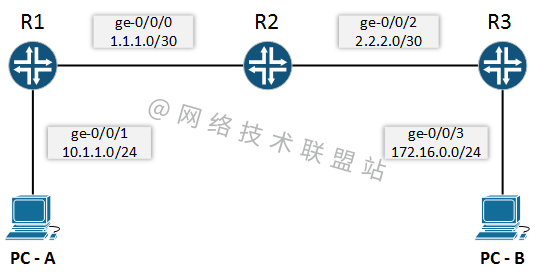 在这里,我们在接口 ge-0/0/0.0 和路由器 R1 的接口 ge-0/0/1.0 上配置了 OSPF 区域 0 (0.0.0.0)。现在对其他两个路由器做同样的事情。