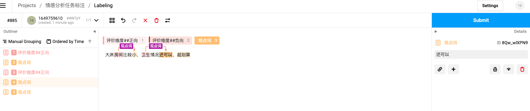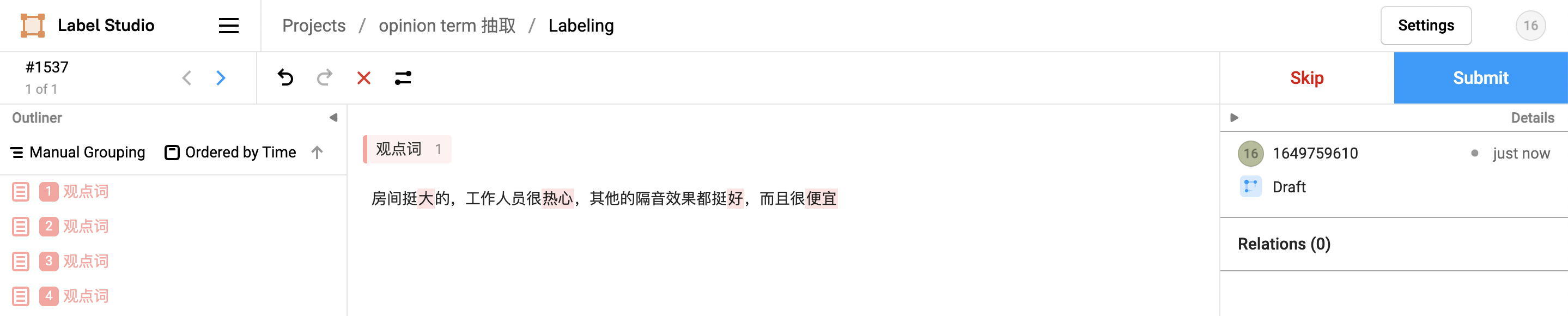 针对观点词(O)抽取任务,采用Span的形式进行标注。 这需要将观点词对应的标注标签设定为观点词。下图展示了关于观点词抽取任务的标注示例。