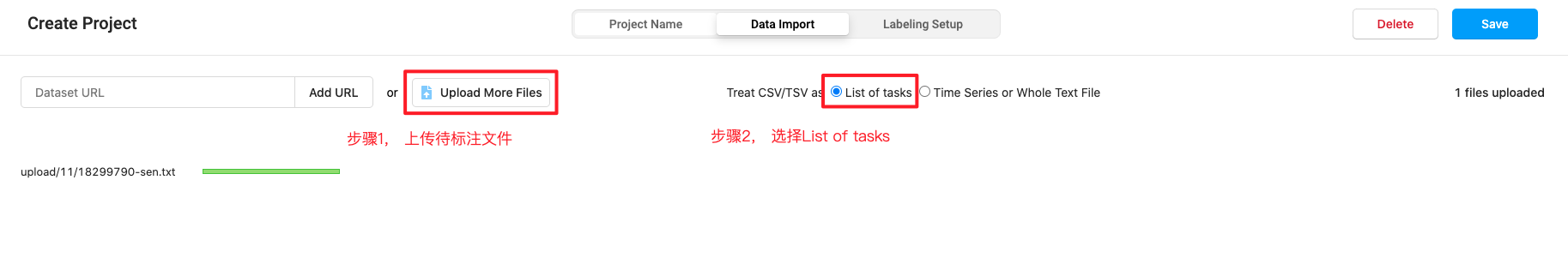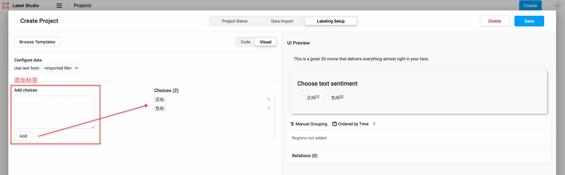 这里对应的任务类型为Text Classification,在标注之前,需要设定正向和负向的标签,然后保存即可。